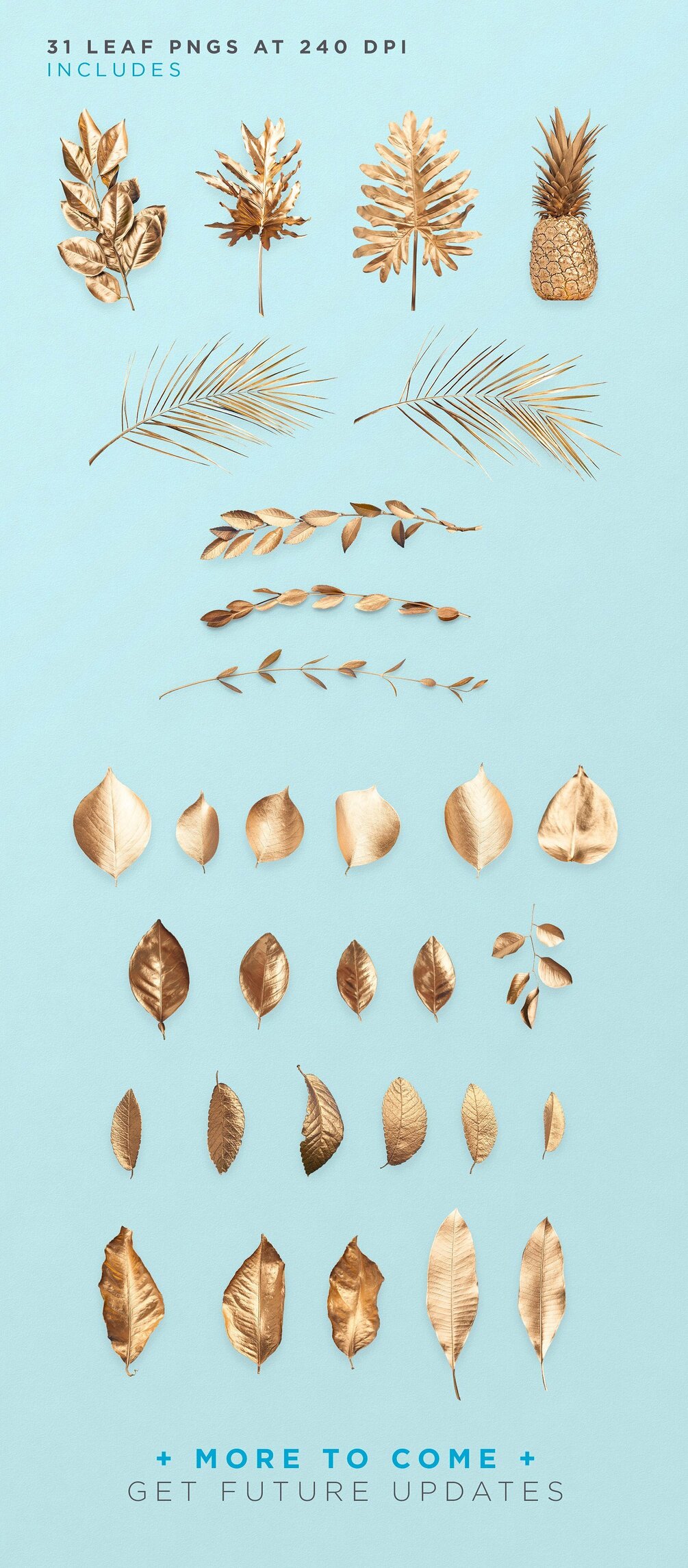 Gold painted leaves are perfect for social media, invitations, greeting cards, wedding things, flyers, brochures, blogs, patterns, packaging, posters, wallpapers, web, scrapbooks, DIY projects and more.